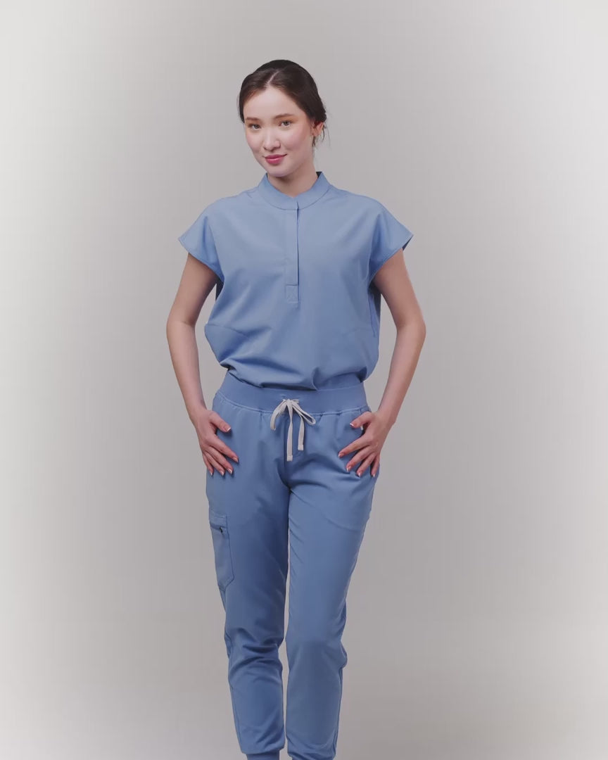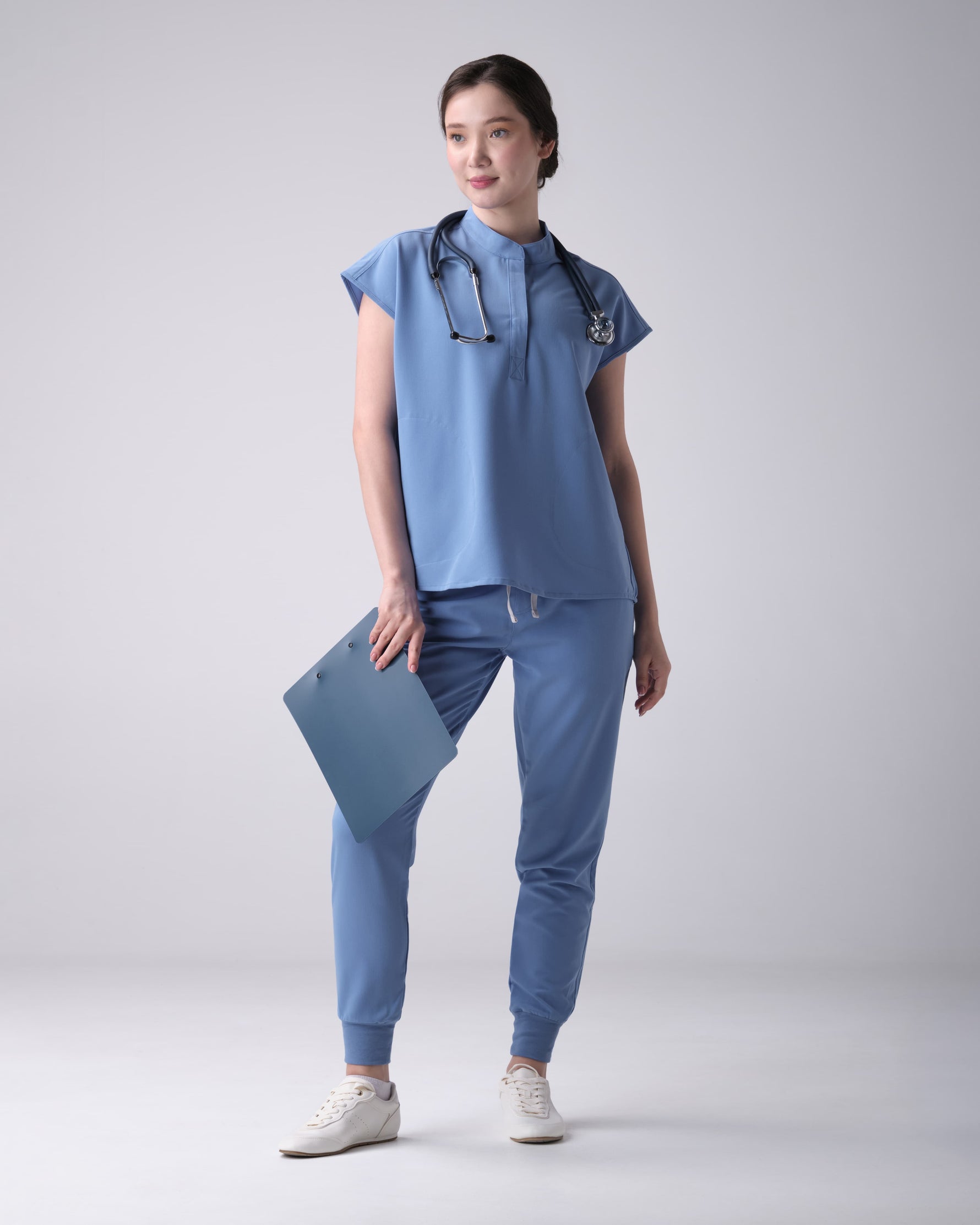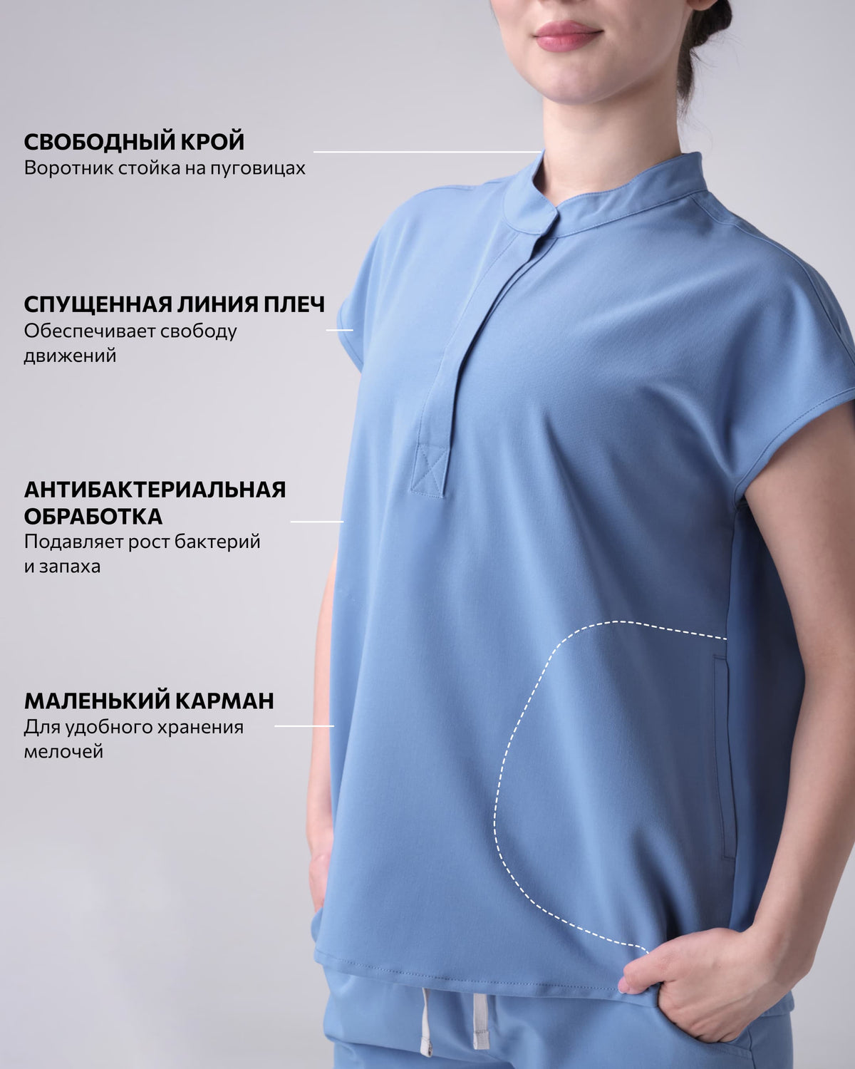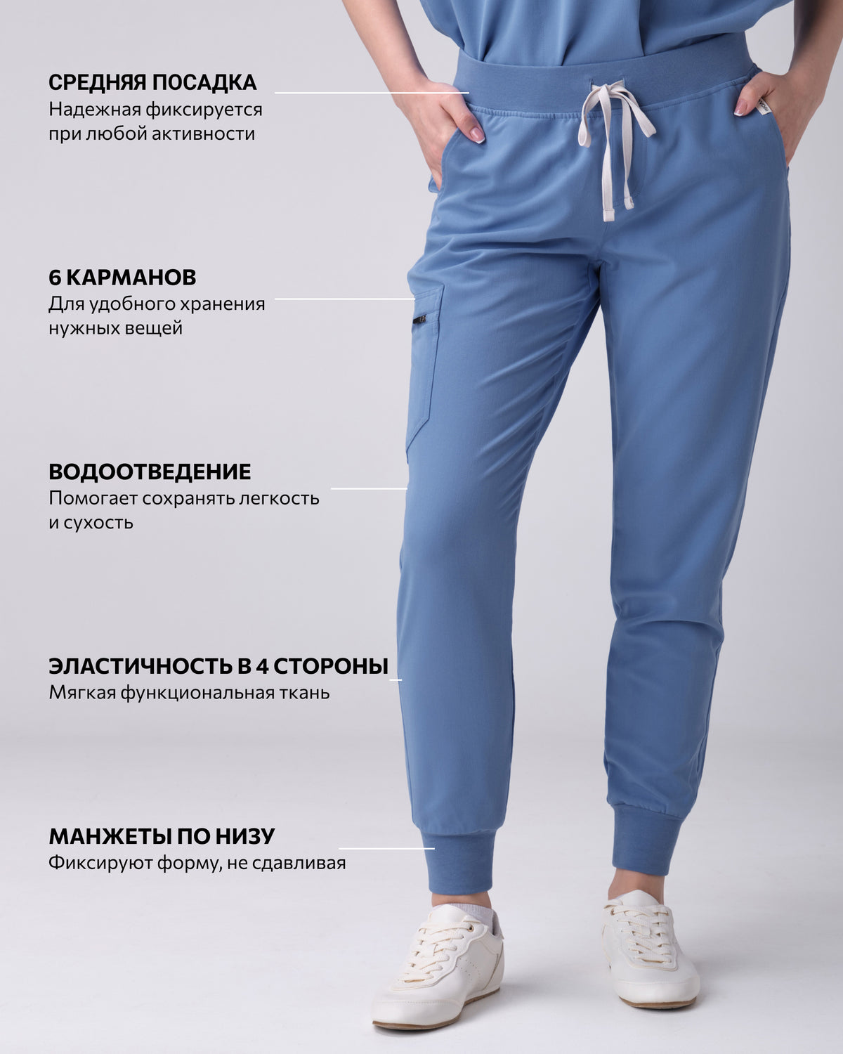 Готовый комплект медицинской одежды: Топ с воротником-стойкой и Джоггеры в голубом цвете.